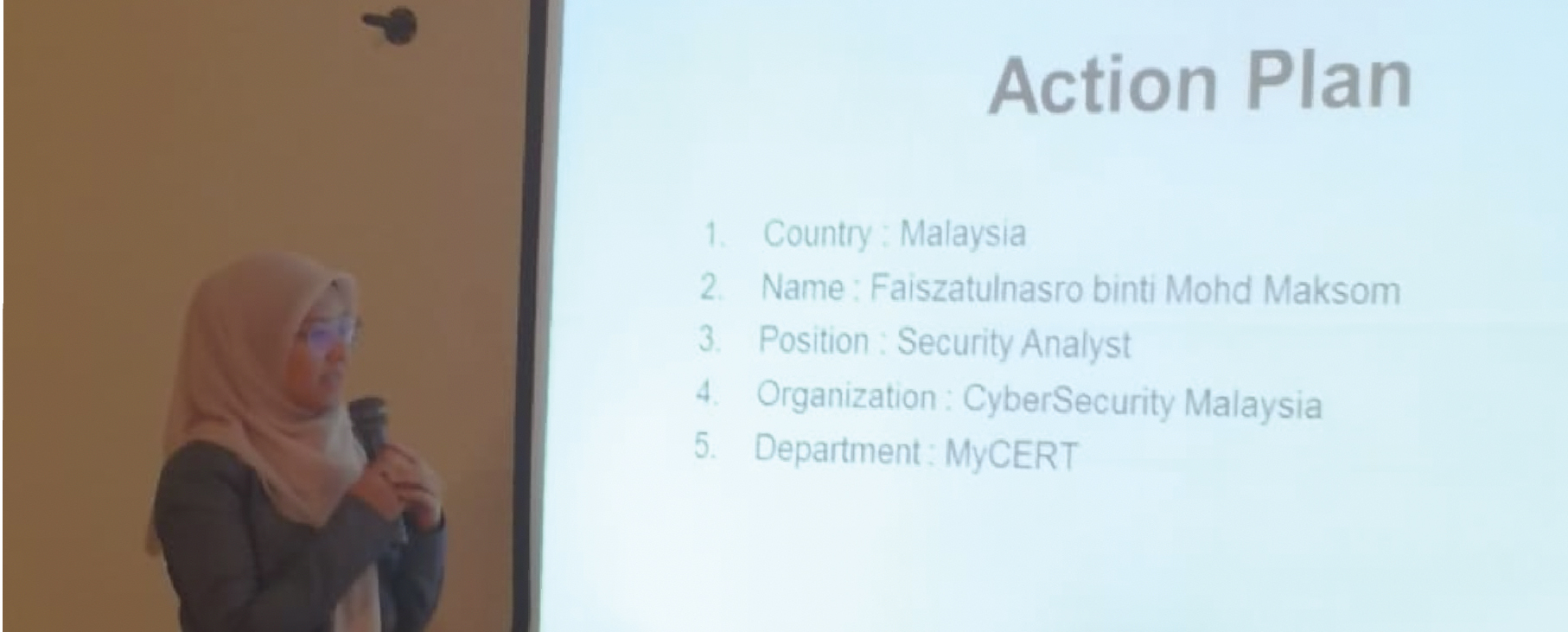 Farah Binti Ramlee from Malaysia Computer Emergency Response Team (MyCERT) represented CyberSecurity Malaysia delivered a proposal titled "Establishment of Threat Intelligence into Incident Response".