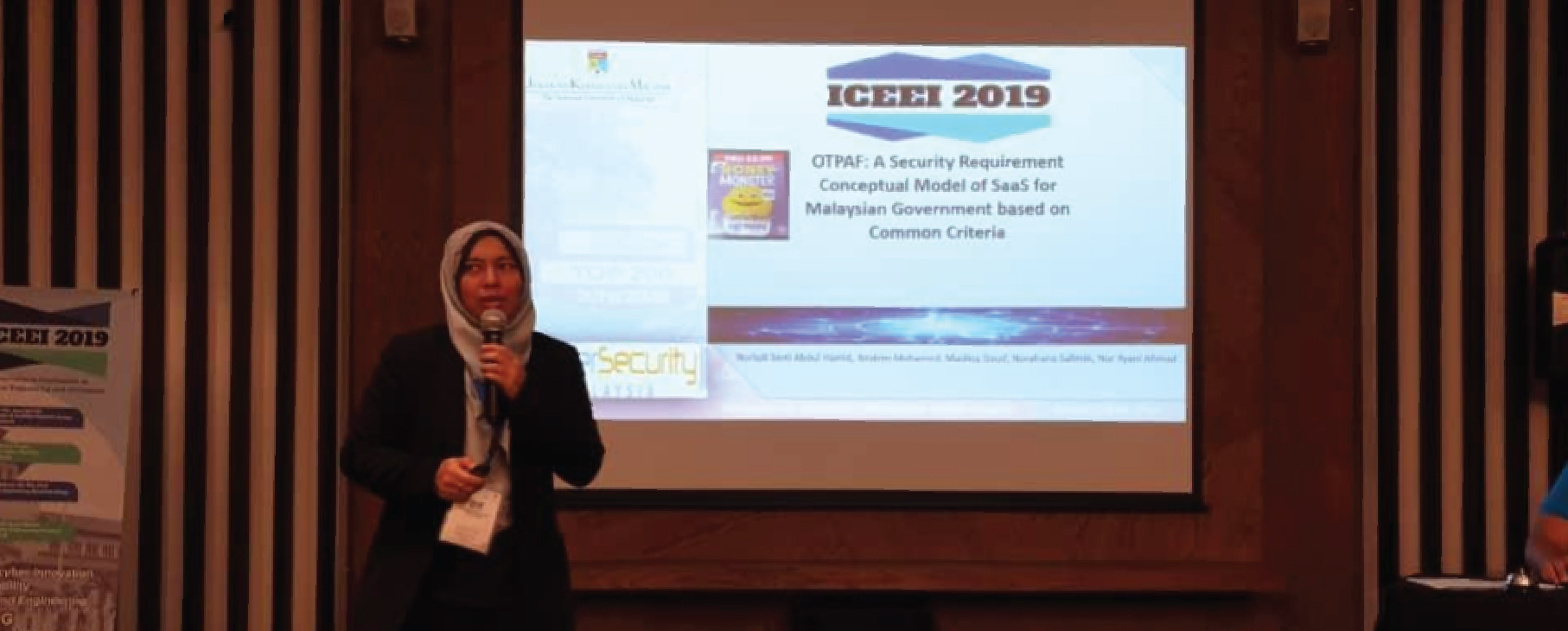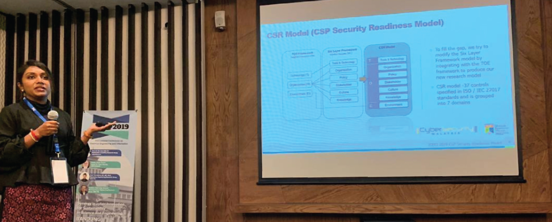 Norahana Binti Salimin, Head of Department of Safety Testing Malaysia (MySEF) and Vijayakumaran Indumathi represented CyberSecurity Malaysia and delivered a presentation on "A Security Requirement Conceptual Model of Cloud SaaS for Malaysian Government based on Common Criteria" and "Cloud Service Provider Security Readiness Model: The Malaysian Perspective."