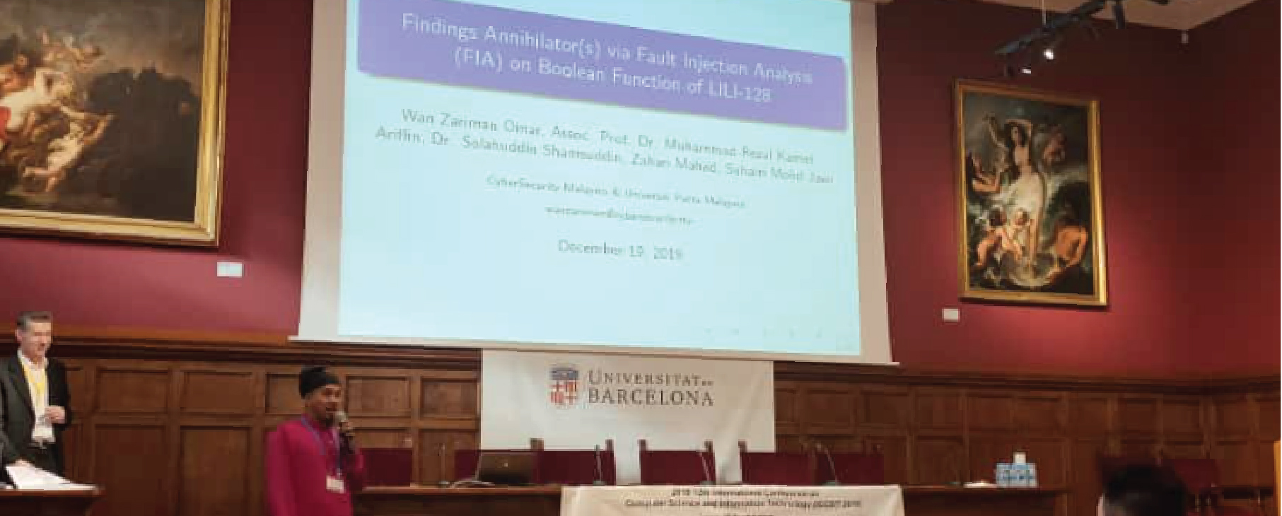 Ts. Dr. Solahuddin bin Shamsudin, Chief Technology Officer, Wan Zariman bin Omar and Abdul Alif bin Zakaria from Cryptography Development Department represented CyberSecurity Malaysia and delivered a presentation entitled "Findings Annihilator (s) via Fault Injection Analysis (FIA) on Boolean Function of LILI 128" and "Secure Information Hiding Based on Random Similar Bit Mapping."