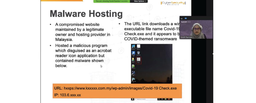 Farah binti Ramlee, Malaysia Computer Emergency Respond Team (MyCERT) Analyst, represented CyberSecurity Malaysia and delivered a presentation on “COVID-19: A Malaysian Case Study during the Movement Control Order (MCO)”.