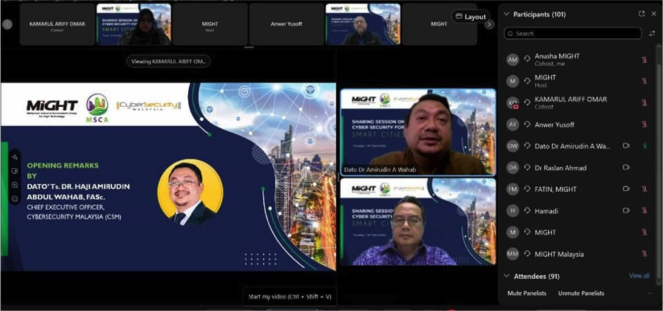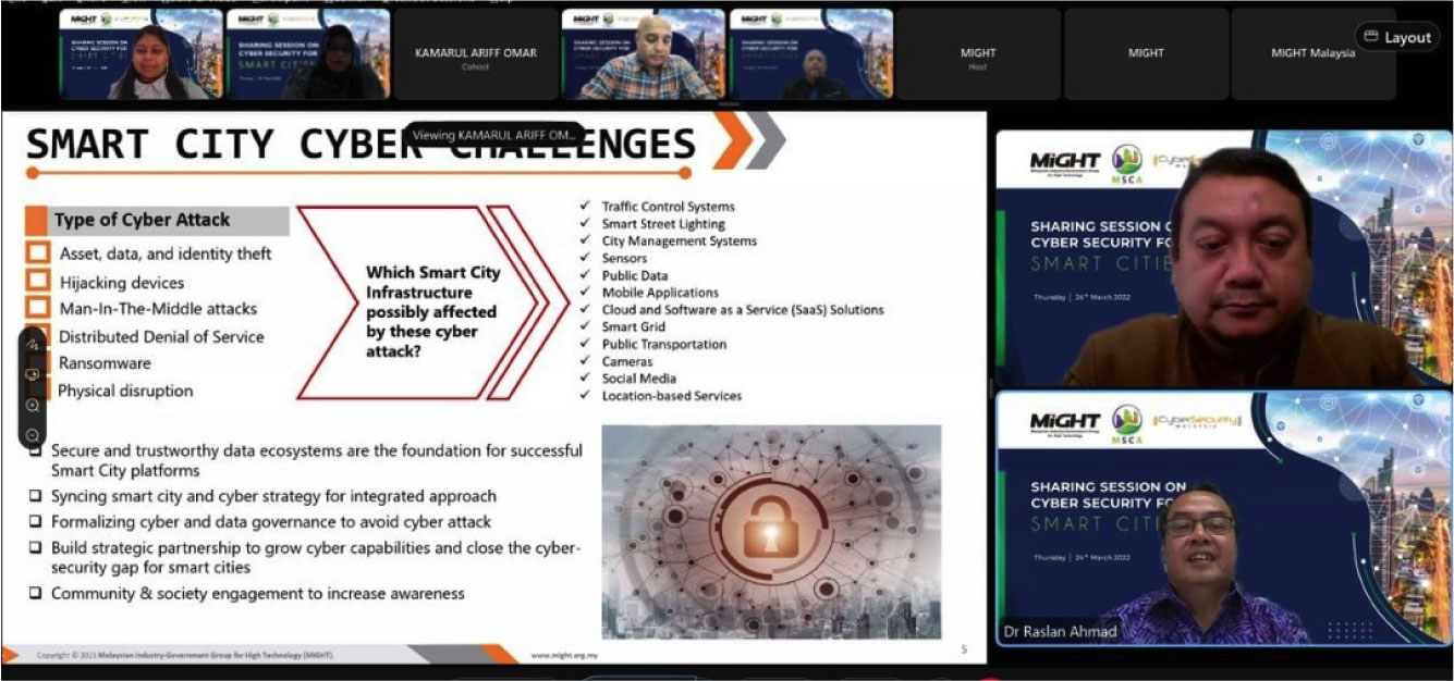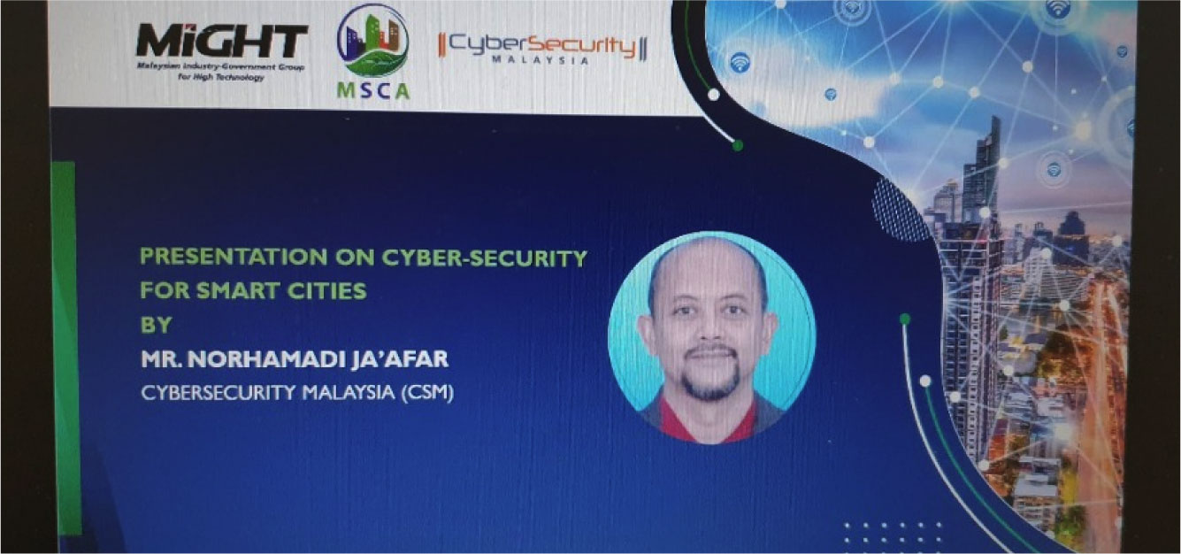 On 23 March 2022, CyberSecurity Malaysia participated in Cyber-Security for Smart City webinar organised by the Malaysia Smart Cities Alliance Association (MSCA) and the Malaysian Industry-Government Group for High Technology (MiGHT) via Webex.